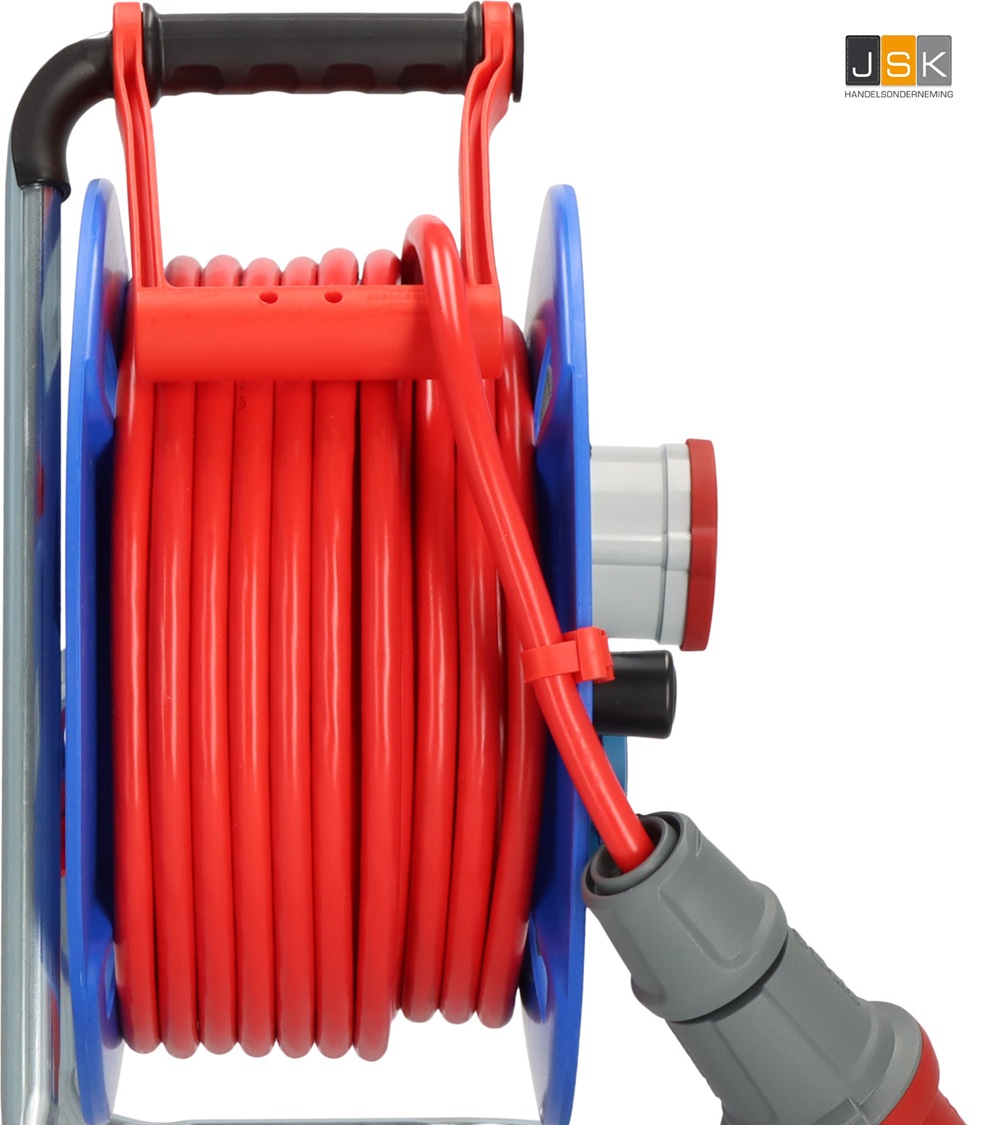 - CEE-kabelhaspel met 3-polige veiligheidsuitschakeling, veiligheidscontactdozen verdeeld over afzonderlijke fasen