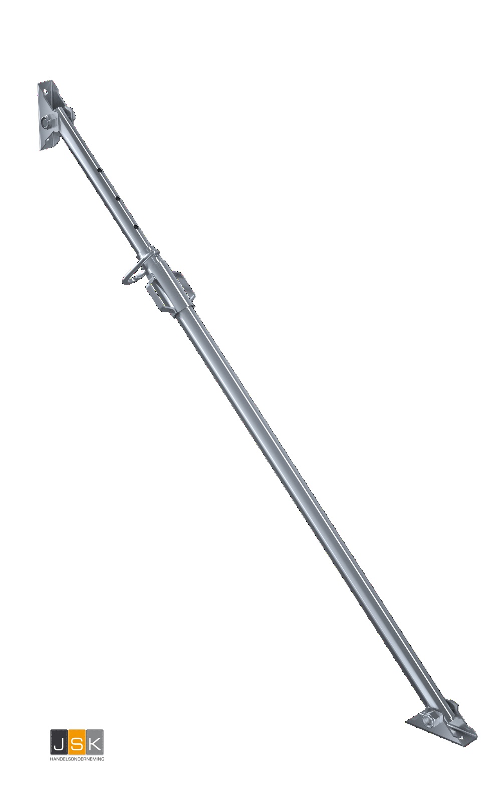 De duw en trekschoor bestaat uit een binnen- en buitenbuis waarmee u ondersteuning kan bieden op verschillende hoogtes. Ingeschoven kan deze duw en trekschoor maximaal belast worden tot 12,26kN en uitgeschoven tot 9,81kN. Doormiddel van de bijgeleverde draagpen stelt u de schoor in op de gewenste hoogte. U steekt de draagpen in één van de openingen op de binnenhuis en zet deze vast.