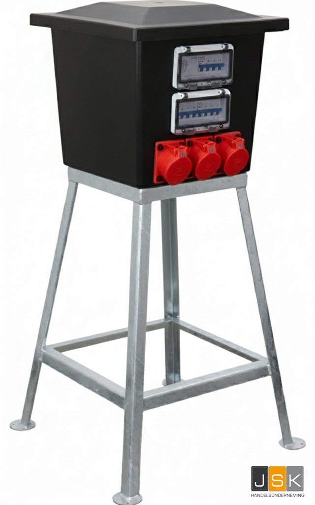 Kunststof verdeelkast QUATRO op frame, Ingang en doorlus: CEE 63A 5p 6h 400V via onderzijde, Hoofdschakelaar: 4p 63A, Afgaand: 6× Schuko 16A 2p+RA 2 - NL20.1306.03032-1