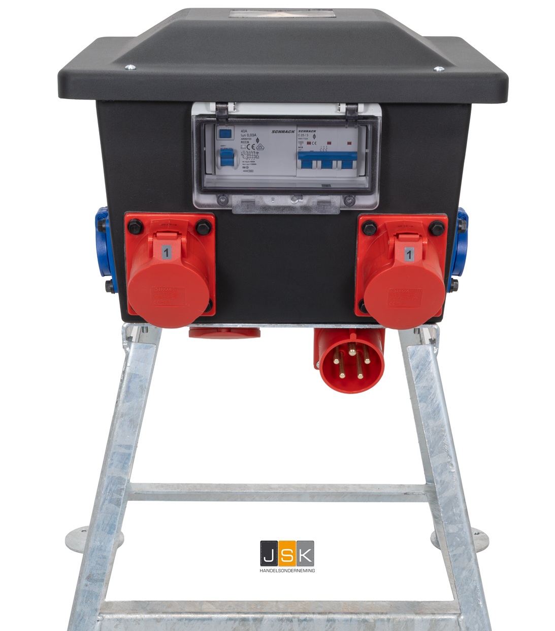 - Ingang en doorlus: CEE 32A 5p 6h 400V via onderzijde