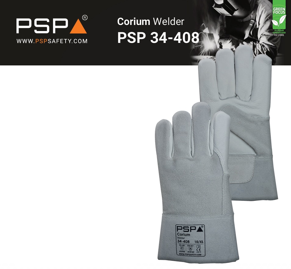 - De PSP Corium Welder 34-408 is een TIG lashandschoen met een A-kwaliteit rundnerflederen palm van 1,0 - 1,2 mm dikte en een A-kwaliteit splitlederen rug en kap (kaplengte 8 cm) van 1,0 - 1,2 mm.