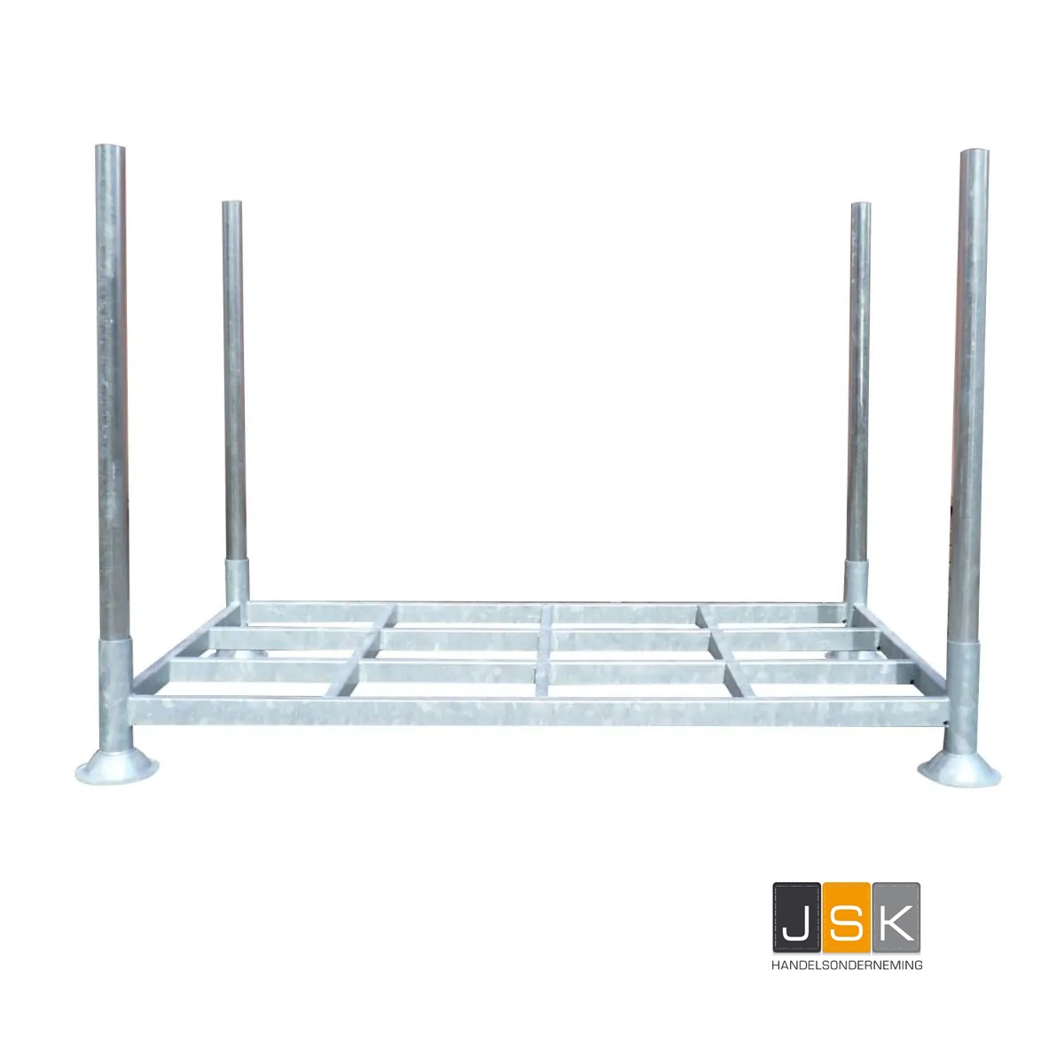 Gebruikt stapelrack 2025x1180x1640 mm (lxbxh) verzinkt met 4 rongen 1500 mm, Buitenmaten Lengte: 1875 mm Breedte: 1060 mm Hoogte: 310 mm, Binnenmaten Lengte: 1850 mm Breedte: 935 mm
