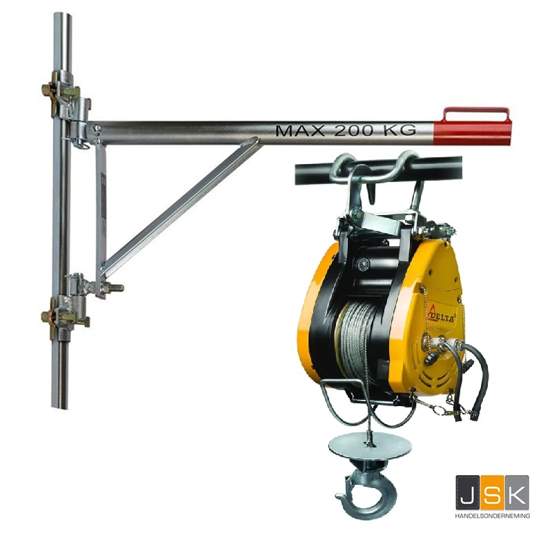Steigertakel / Steigerlier electrisch 230V/230 kg met zwenkarm en 2 buisklemmen/koppelingen geleverd met testcertificaat, CE-conformiteitsverklaring en gebruiksaanwijzing