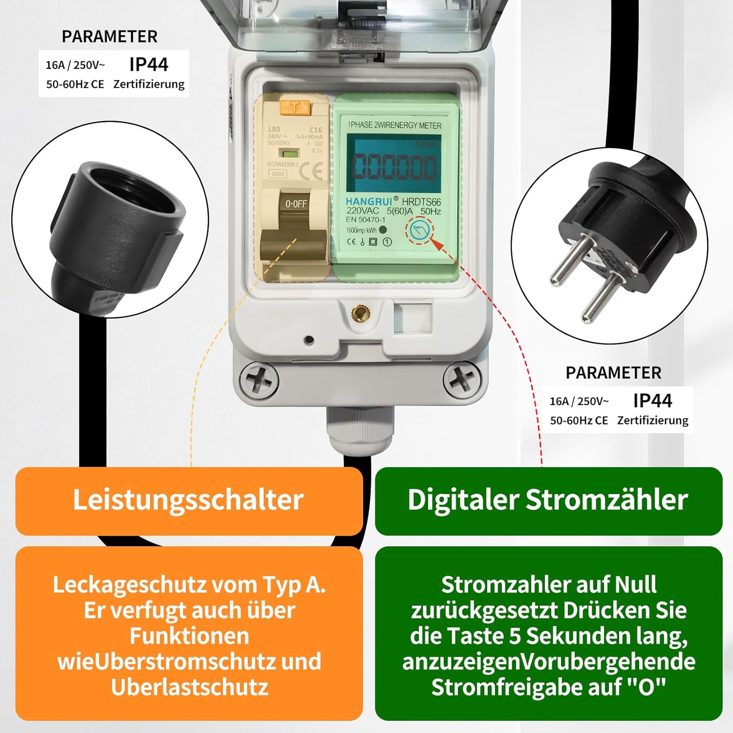 Stroommeter voor stopcontact 230 VAC 16A, mobiele digitale elektriciteitsmeter voor stopcontact met FI circuit Breaker type A, 230V IP44 Schuko Plug, tussenmeter power met IP67 elektrische meter