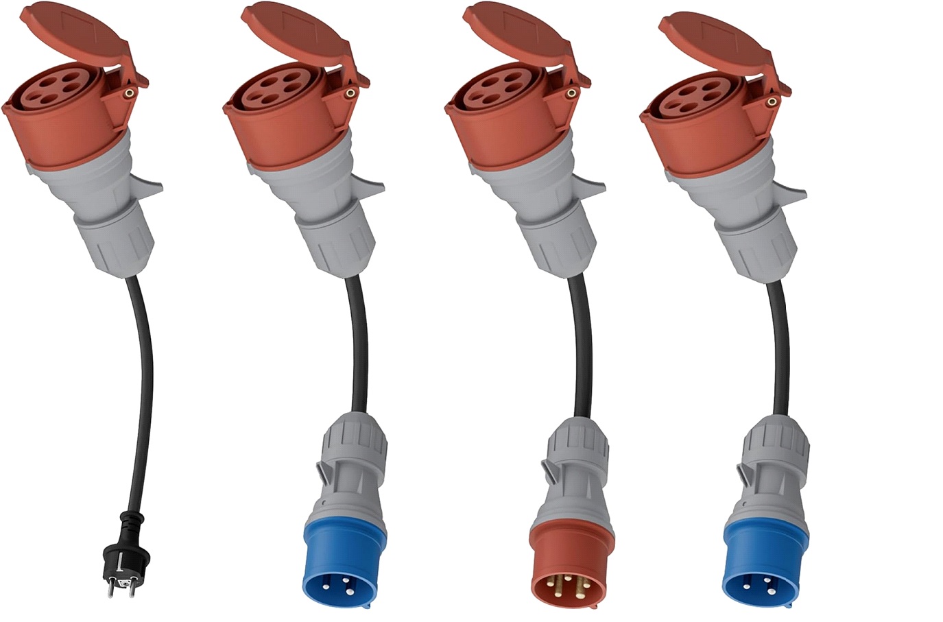 Adapterset (4x) voor alle laadstations met 32A CEE driefase aansluiting. Hiermee kan de autolader worden aangesloten op 16A CEE driefase (rood), 16A CEE enkelfasig (blauw / campingstekker), 32A CEE enkelfasig (blauw / campingstekker) en contactdozen voor huishoudelijk gebruik (veiligheidsstekker).