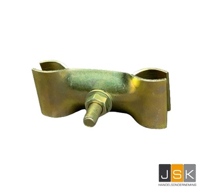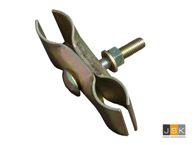 De standaard koppeling (bouwhekklem) is gemaakt van zeer degelijk materiaal en voorzien van een bout en een moer, die te monteren is met een ring/dopsleutel. Hierdoor kunt u de bout handmatig aandraaien.