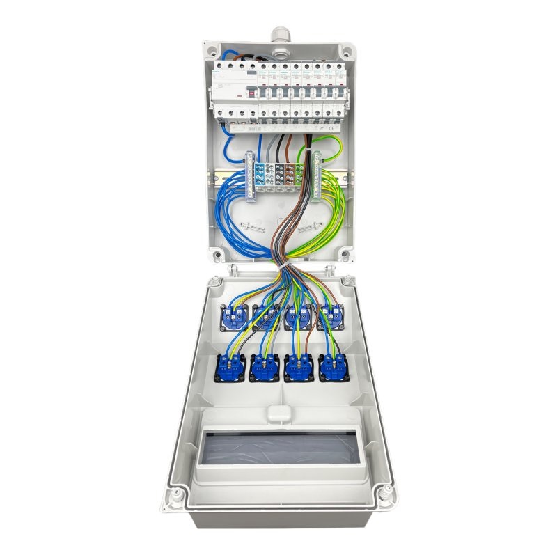 Voorbedrade stroomverdeler in ABS-behuizing incl. N- en PE-aansluiting. Voorzien van 4x geaarde stopcontacten 230V 16A, 1x CEE stopcontact 16A 400V 5P en 1x CEE stopcontact 32A 400V 5P van het merk PCE. Geleverd zonder toevoerleiding. Alle stopcontacten werken via een aardlekschakelaar (aardlekschakelaar 40A/ 30mA). 2 geaarde stopcontacten zijn gezekerd met een miniatuur stroomonderbreker 1C16A. Beide CEE-stopcontacten zijn gezekerd met een 3-polige miniatuurstroomonderbreker. Alle zekeringselementen zijn van het merk Siemens. De stroomverdeler kan zowel als stationaire wandverdeler als als mobiele stroomverdeler worden gebruikt.
