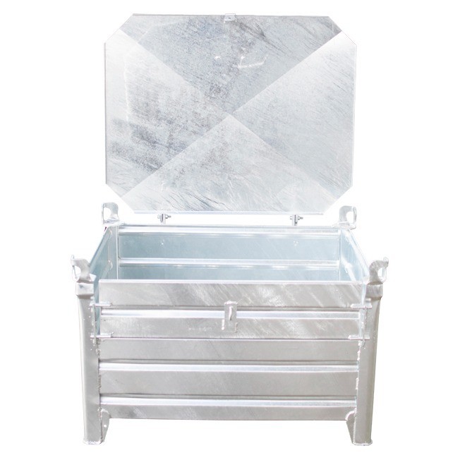- De stapelbak met voorklep en deksel met de afmetingen 1000x800x600mm.