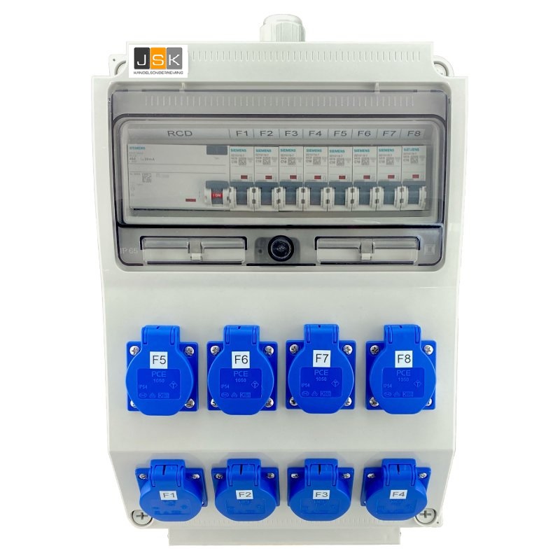 Voorbedrade stroomverdeler in ABS-behuizing incl. N- en PE-aansluiting. Voorzien van 4x geaarde stopcontacten 230V 16A, 1x CEE stopcontact 16A 400V 5P en 1x CEE stopcontact 32A 400V 5P van het merk PCE. Geleverd zonder toevoerleiding. Alle stopcontacten werken via een aardlekschakelaar (aardlekschakelaar 40A/ 30mA). 2 geaarde stopcontacten zijn gezekerd met een miniatuur stroomonderbreker 1C16A. Beide CEE-stopcontacten zijn gezekerd met een 3-polige miniatuurstroomonderbreker. Alle zekeringselementen zijn van het merk Siemens. De stroomverdeler kan zowel als stationaire wandverdeler als als mobiele stroomverdeler worden gebruikt.