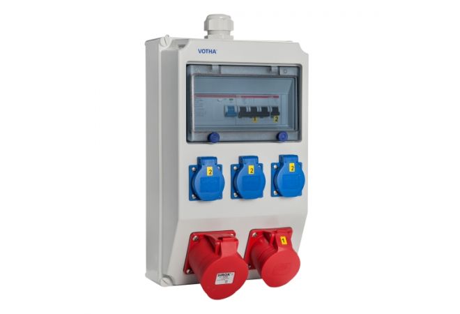Productinformatie "VOTHA WOLFSBURG wandverdeler - bedraad met 1x CEE 32 A, 1x CEE 16 A, 3x WCD'S 230 V en aardlekschakelaar 40 A 0,03 A (4P)"
